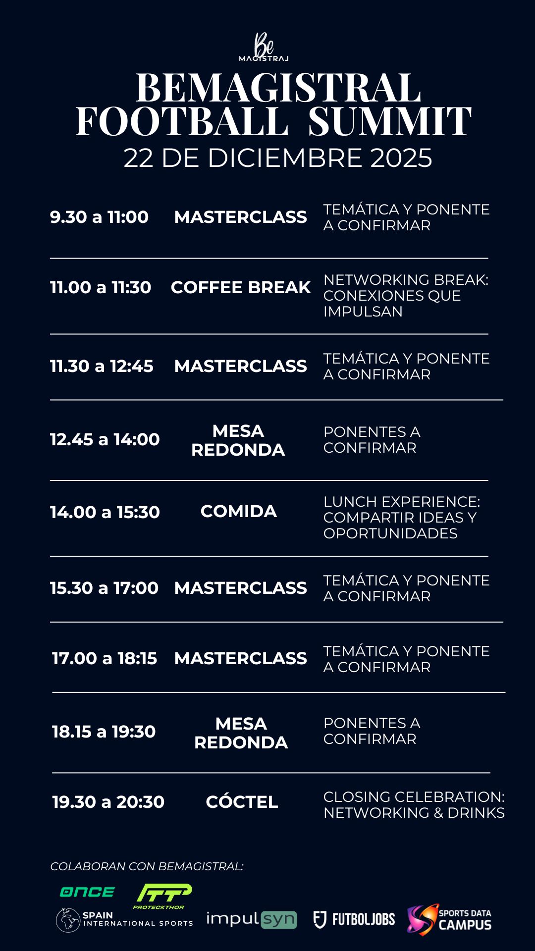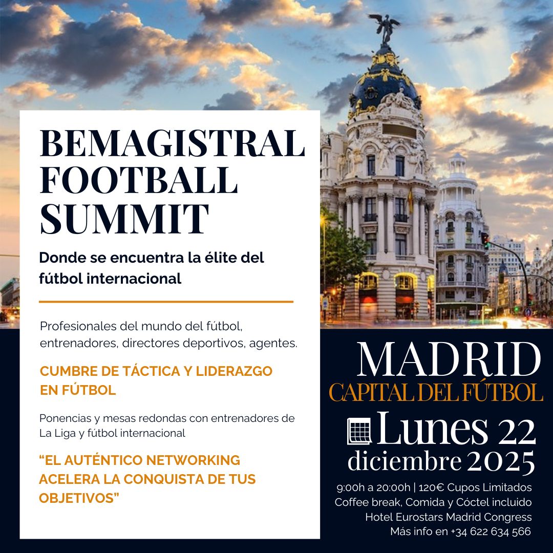El día lunes 22 de diciembre, el Bemagistral Football Summit llega a Madrid para reunir a los grandes nombres de la táctica, el liderazgo y el futuro del fútbol mundial. ¡Prepárate para ser parte del evento más esperado del año en el fútbol internacional!